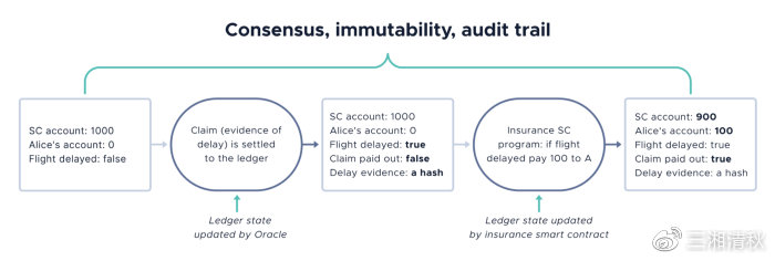 智能合约的状态被发布到分布式账本上。当一个更新发生并且网络对变更达成一致意见时,一个新的交易被附加到账本以更新合约的状态: