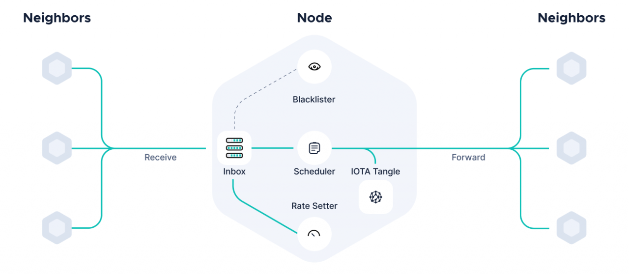 调度器的工作原理是这样的:在收到消息后,它们会被放入收件箱中。每条消息都会根据其消耗资源的多少被分配一个 “工作分数”。较大的消息有较大的分数,因为它们使用更多的带宽。一个包含100个签名的事务的消息比一个只有一个签名的事务有更高的分数,因为它需要更多的资源来验证签名。本质上,调度器确保每秒消耗的资源数量最多。开发这个的研究人员和工程师可以完全自由地定义这个工作函数,以使算法适应IOTA网络的确切需求。