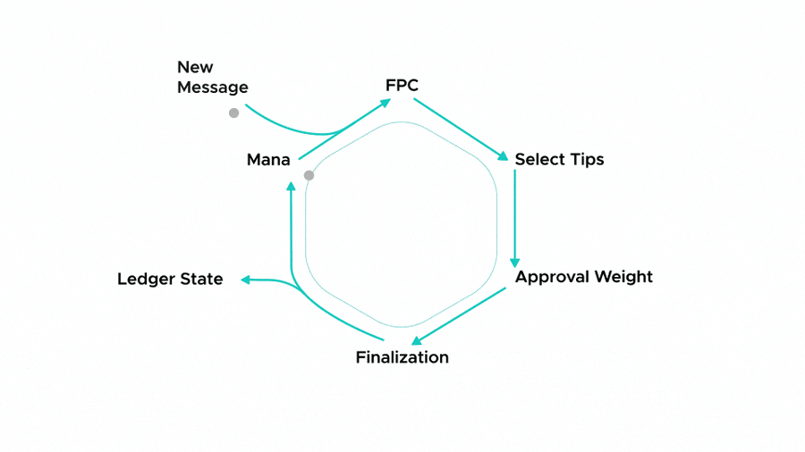 在解释每个模块之前,我们总结一下它们是如何互动的。信息通过拥堵控制算法进入网络,该算法进行访问管理。节点通过我们的投票协议快速概率共识(FPC)对新的冲突进行投票,该协议决定哪些分支应该被拒绝。FPC投票由Mana保护,它是一个公平地限制谁可以投票的信誉系统,以防止攻击者。在FPC拒绝坏的分支后,从正确的分支中选择提示作为新信息的参考。随着这些正确的分支获得更多的信息,我们说它们的批准权重就会增长。一旦一个分支获得足够的批准权重,它的交易就会被最终确定并记入账簿,而Mana也会被更新,以确定下一个FPC投票者。