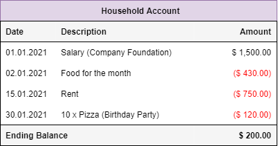 这是一种非常简单的分类账,大多数人都很熟悉,它通常由3栏的条目清单组成。余额的增加通常以黑色显示,减少则以红色显示(带括号)。