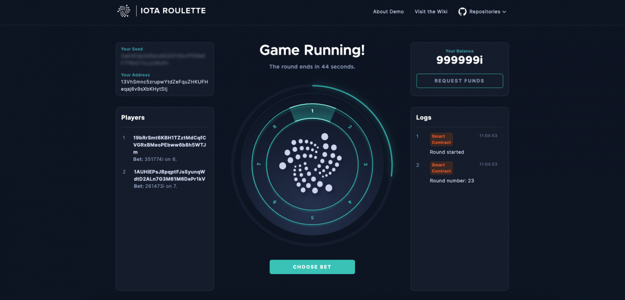 为了演示这个版本中的一些变化,我们决定更新Faire Roulette这个合约Demo的概念证明,并将其部署在一个公开的链上供任何人测试。这个演示允许用户存入DevNet IOTA代币,并用它们在虚拟轮盘桌上进行玩耍。这个概念使用IOTA智能合约内置的分布式随机数生成器(dRNG)来生成一个可证明的随机数,以决定获胜的数字。演示的代码可在Wasp资源库中找到,并与新的IOTA智能合约模式工具完全兼容。该演示也可以在我们的公共测试网上试用,其图形界面在demo.sc.iota.org上运行。请欣赏!