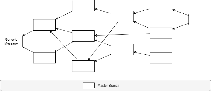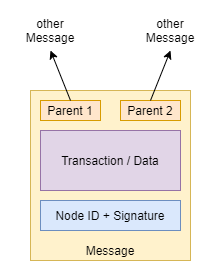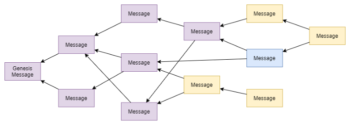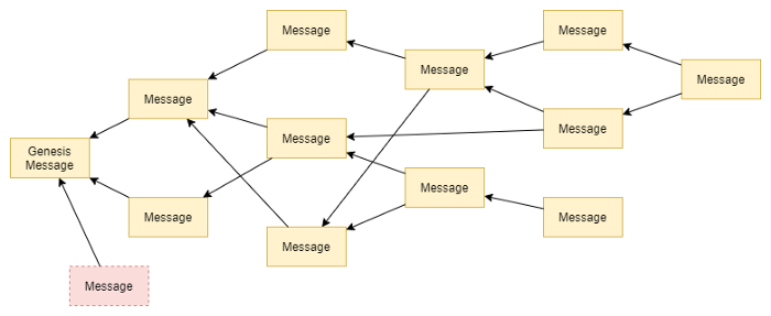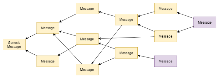为了解决这个问题,我们将使用中本聪的想法,使信息形成一个DAG(有向无环图),后来的信息参考先前的信息。与每个区块只引用一个区块的区块链相比,IOTA中的一个消息引用了两个父区块,这使我们能够摆脱建立总排序的需要。