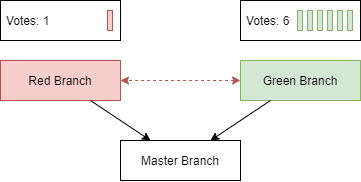 分支DAG:绿色分支比红色分支获得了更多的批准和投票