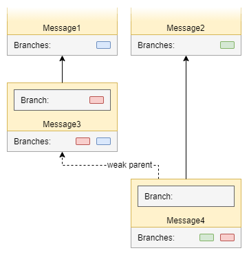 Message4引用具有弱父级的Message3,并忽略其过去锥体中的分支(蓝色)