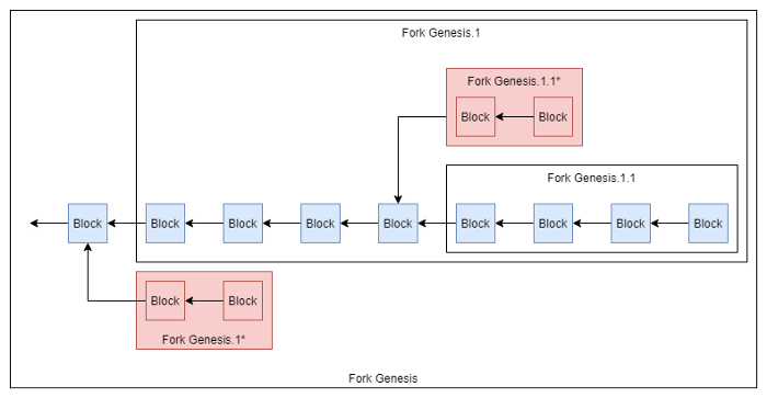 与其把它们看成一条最长的链,不如把它们看成一棵树,所有被放弃的分叉仍然可见,关于哪个分叉应该占上风的投票结果被计入竞争链的长度。