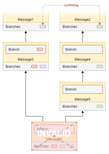 现在发生的事情是,两个冲突的事务将被记录到它们对应的分支中,这些新引入的分支将根据我们刚刚定义的规则自动传播到Tangle中的消息中。