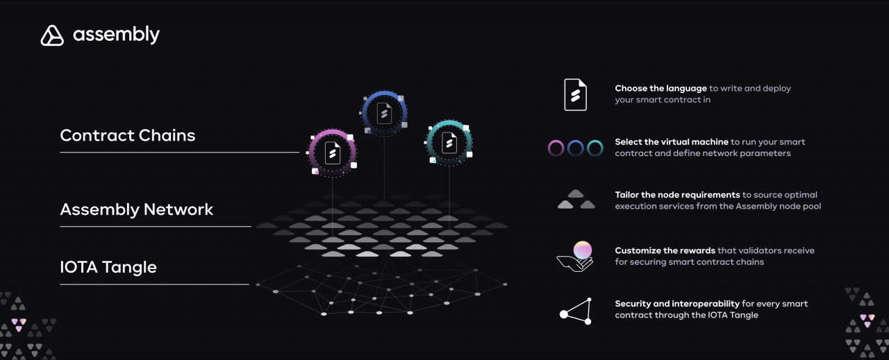 Assembly的架构是基于IOTA智能合约框架的。无需许可网络由一个验证者共享池组成,这些验证者可以保证智能合约链的安全,并将锚状态提交给IOTA Tangle。对于他们的工作,验证者将获得质押奖励、交易费用或智能合约链定义的其他代币激励。验证器的不当行为是可以被证明的,并且很容易被检测到,这最终导致了质押被没收和协议对验证者的轮换。任何人都可以成为验证者,只需要一个操作节点和少量的ASMB (Assembly网络的原生代币)的质押。