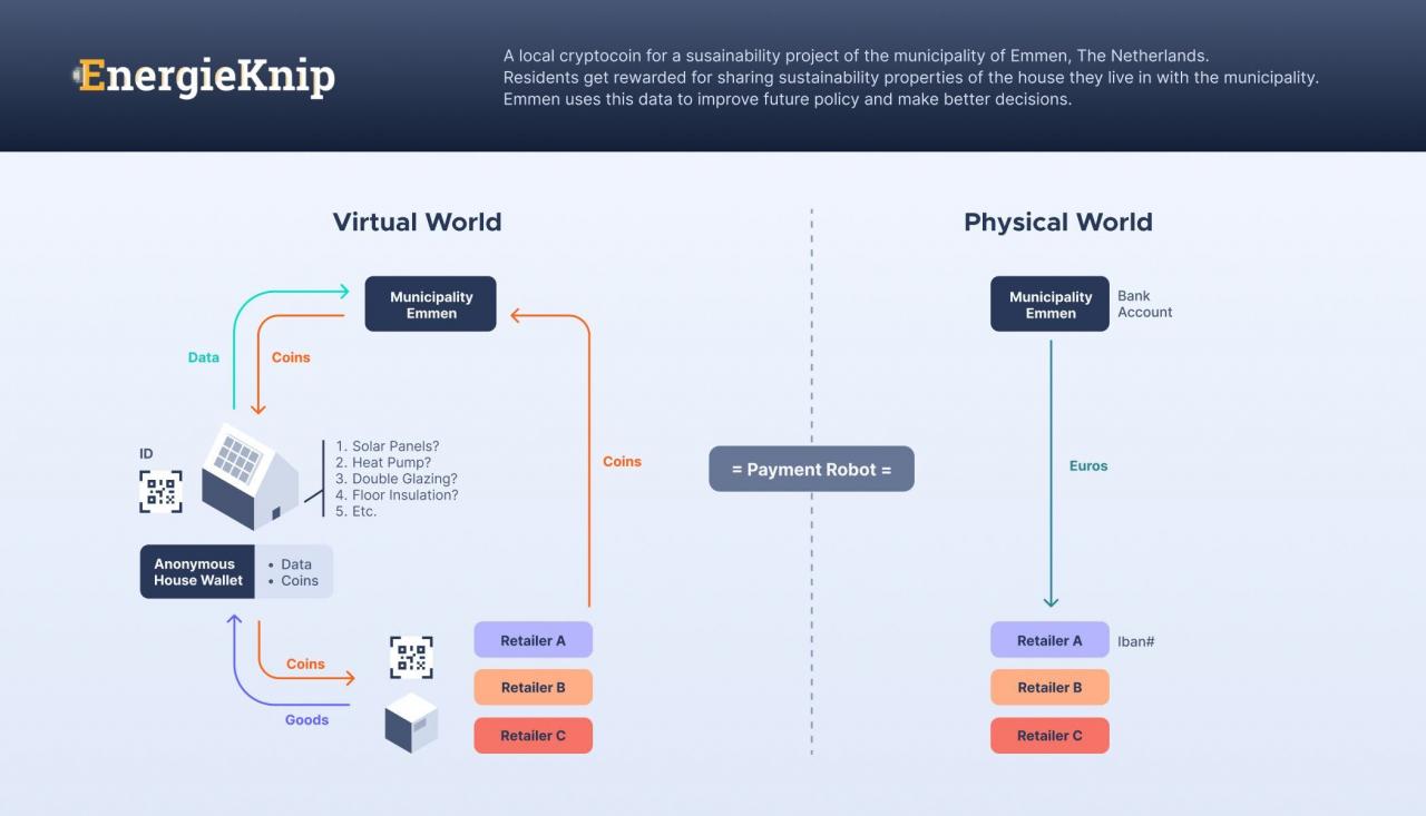 居民在配套的应用程序中回答关于他们家的节能措施和行为的问题(例如,屋顶上有多少太阳能电池板,或者窗户是否有双层玻璃,或者他们是否在晚上关闭电视或将其置于待机状态)(通过这样做,信息被存储在Tangle上)。每上传一份数据到应用程序并被埃门市政府收到,EnergieKnip的币或积分就会被发送到奖励的钱包中。然后,这币将由居民在当地零售商处消费,以购买新的节能设备。