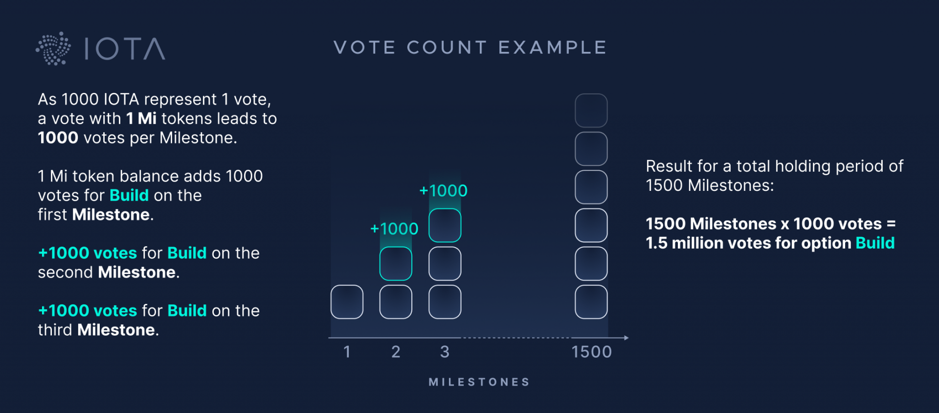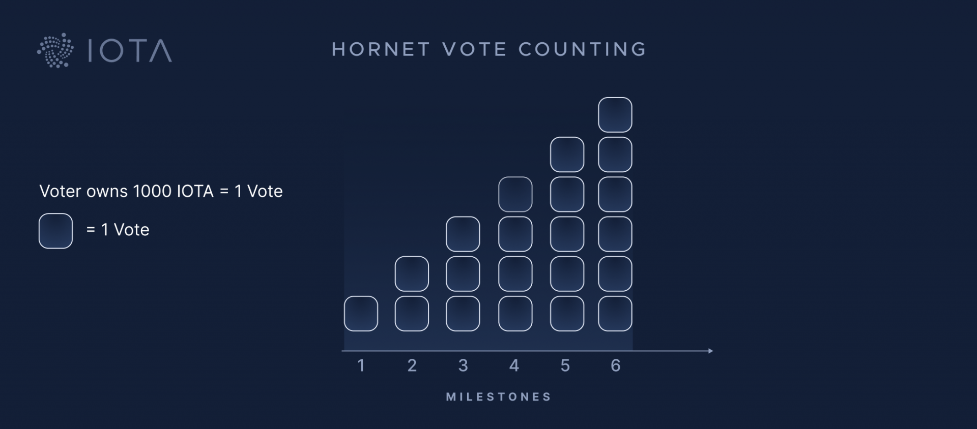 在 “计数开始 “阶段(Tangle中被定义为起点的里程碑)开始后,每个里程碑的相应票数将被计算出来,其中代币在UTXO上被确认,并附带投票元数据。社区已经定义,1000 IOTA(1 Ki)代表每个里程碑的一票。