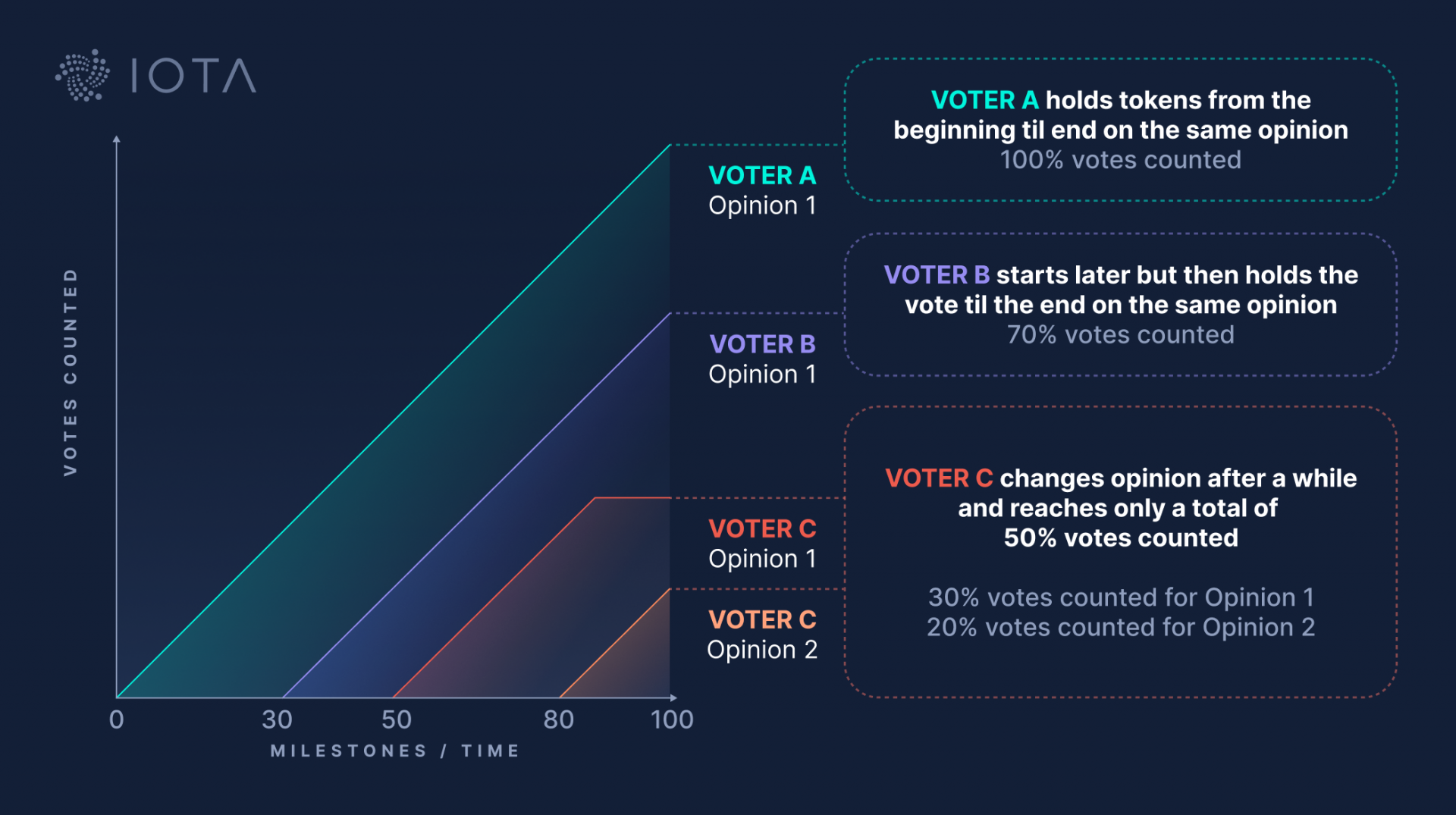 计票开始(10天):这个阶段直接在 “投票开始 “阶段之后。现在,用户宣布的投票由节点软件计算,并开始随着每过一个里程碑(网络中每10秒发出一个里程碑)而增加持有时间的权重。如果用户成功地保持了预定的里程碑数量,投票者将达到与投票中使用的代币数量有关的100%的可能投票。如果用户在这个阶段改变了他们的投票,新选择将从改变的时间点开始计票。虽然投票者的意见改变了,但之前的意见并没有被驳回,已经获得的和计算的票数仍然有效(见下文的例子)。