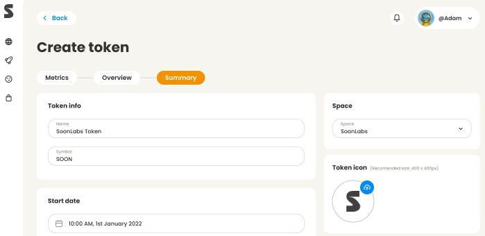 空间将能够创建代币并在Soonaverse上进行公开募集。当需要用到代币时,任何人都可以进入他们的空间并创建一个代币。要创建一个代币,空间守护者将需要填写信息,包括名称、符号、图标、总供应量、分配百分比等。