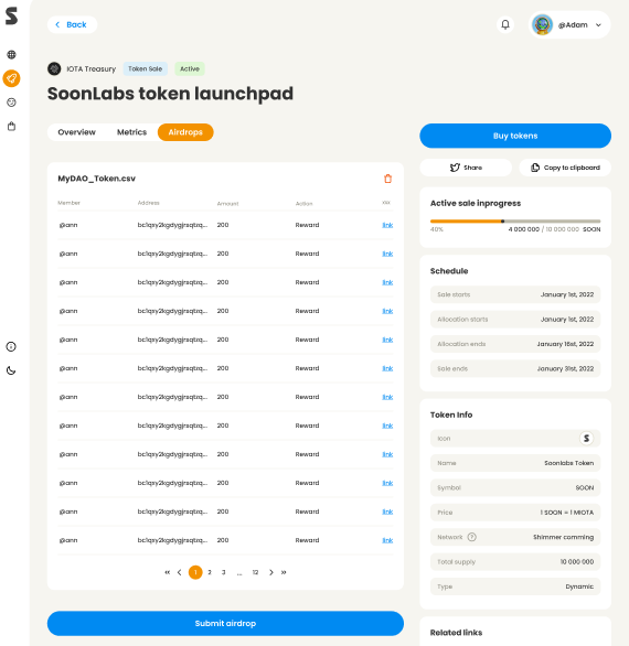 如果该空间希望使用代币发射台,那么他们会将其分配的一个标记为 “公开销售”。如果没有选择公开销售的分配,那么它将只是创建一个可以空投的代币。对于空投,空间监护人需要做的是上传一个CSV,其中包括MetaMask地址,每个地址得到多少代币,以及它来自哪个分配桶。
