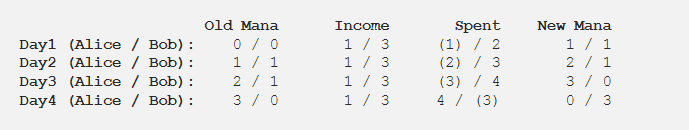 爱丽丝总是出价她的全部法力持有量,但持续出价超过她(失败的TXS得到他们的法力偿还)会变得令人望而却步,因为在某些时候,烧毁的费用超过了收入,相应地在第4天爱丽丝将能够移动她的资金。